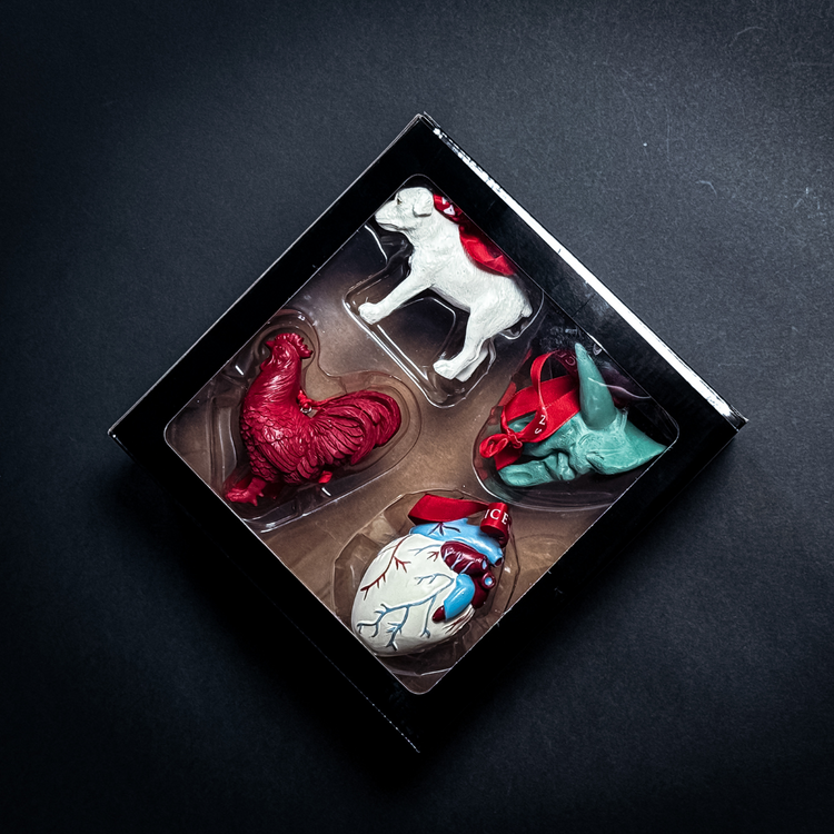 Set of (4) individual molded ornaments Ornament size: approx. 3.5"h Material: resin Hanging ribbon with printed logo Packages in a custom window box