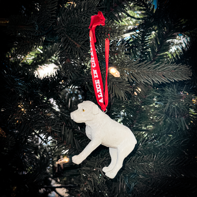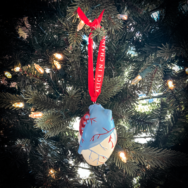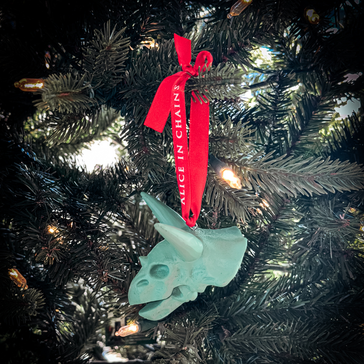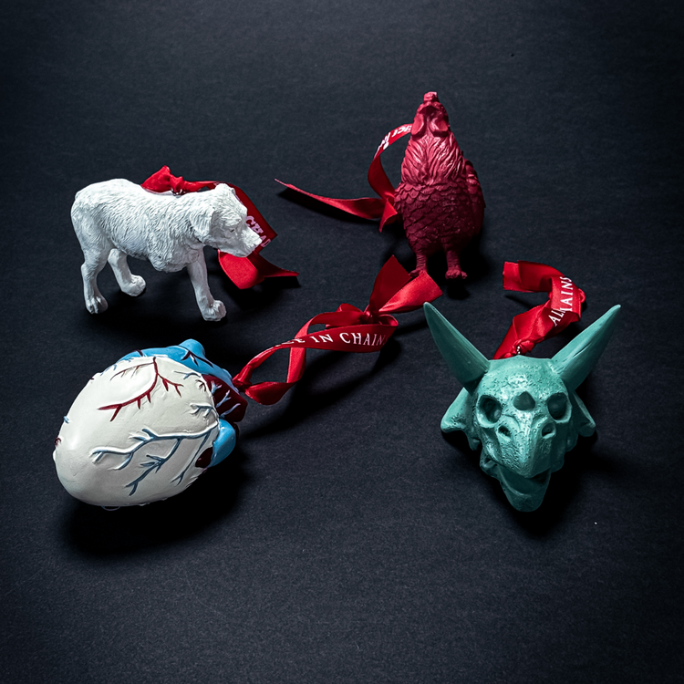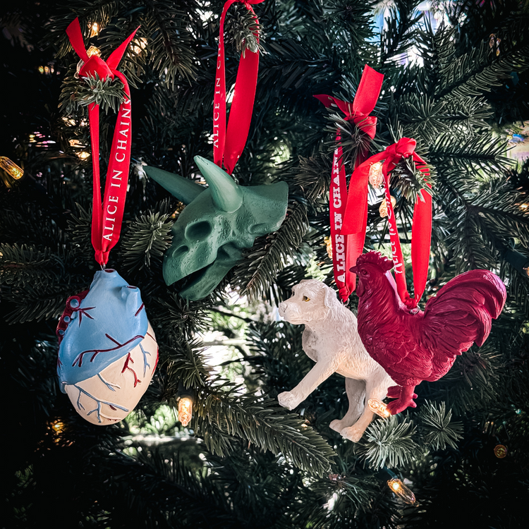 Official Alice In Chains merchandise. Limited edition, custom holiday ornament set featuring four 3D mold ornaments inspired by album iconography. Each ornament has a printed red ribbon featuring the icon's era logo.